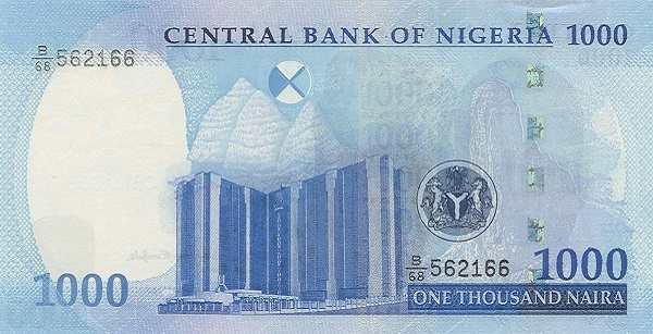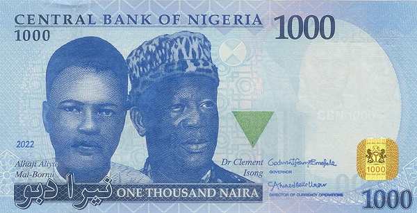 - 1000 найр: Самая крупная купюра отличается тем, что на ней размещены два портрета: Али Маи-Борну и Клемента Изонга — оба были управляющими Центрального банка Нигерии. На обороте изображено здание Центрального банка в новой столице, Абудже.