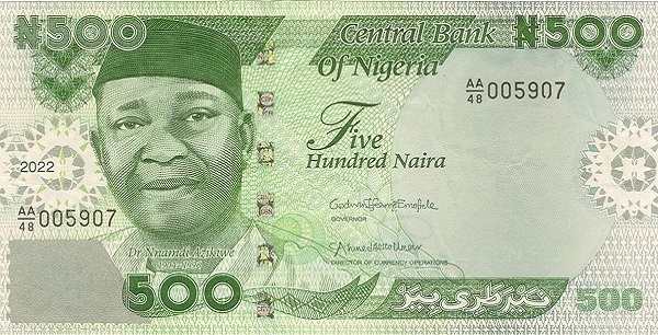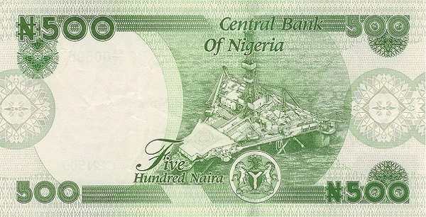 - 500 найр: На купюре изображён портрет Ннамди Азикиве — первого президента независимой Нигерии. На оборотной стороне можно увидеть морскую нефтяную платформу, символизирующую важнейшую отрасль экономики страны.
