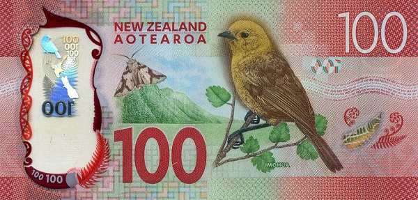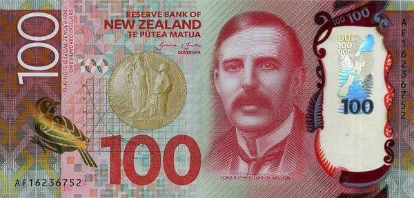 - Купюра 100 долларов красного цвета прославляет Эрнеста Резерфорда, выдающегося физика, лауреата Нобелевской премии. На оборотной стороне — буковый лес с желтоголовой мохуа.