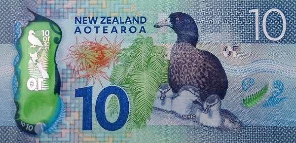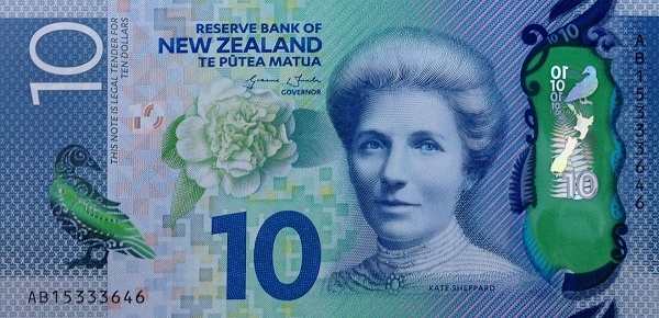- Купюра 10 долларов выполнена в синих тонах и увековечивает память Кейт Шеппард, ведущей деятельницы движения за избирательное право женщин. На обороте — речной пейзаж с синей уткой.