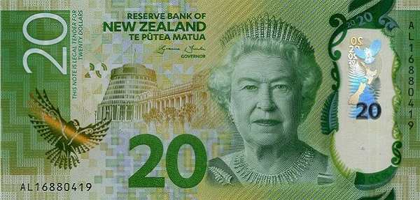 - Купюра 20 долларов зеленого цвета традиционно содержит портрет британского монарха (до недавнего времени — Елизаветы II), а также изображение здания парламента Новой Зеландии. На оборотной стороне — альпийский пейзаж и новозеландский сокол.