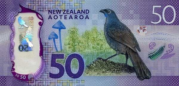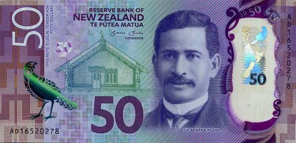 - Купюра 50 долларов фиолетового цвета посвящена сэру Апиране Нгата, видному деятелю маори. На обороте изображен хвойный и широколиственный лес с птицей кокако.