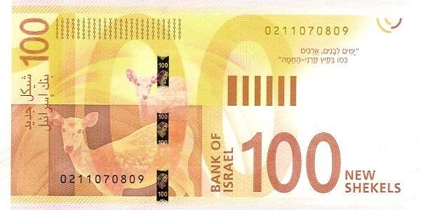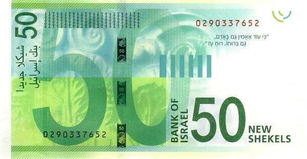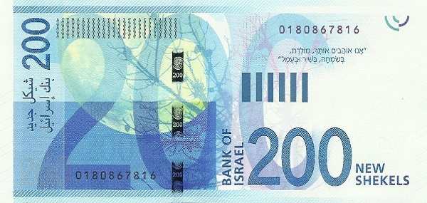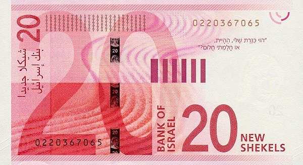 В вашем кошельке могут оказаться купюры следующего номинала: 20, 50, 100 и 200 шекелей. Израиль активно внедряет современные технологии для повышения долговечности денег. Так, с 13 апреля 2008 года в оборот была введена полимерная купюра в 20 шекелей. Несмотря на то, что стоимость изготовления такой купюры примерно в полтора раза выше, её износостойкость многократно превышает бумажные аналоги, что делает их использование более выгодным и экологичным в долгосрочной перспективе.