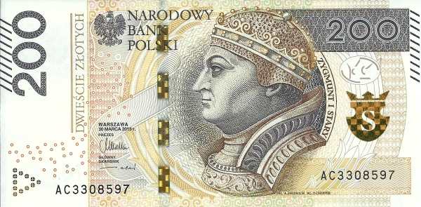 - 200 злотых: Относительно новый номинал, введенный в обращение, с портретом Сигизмунда I Старого.