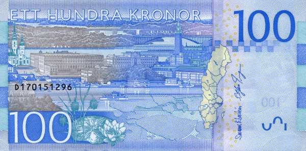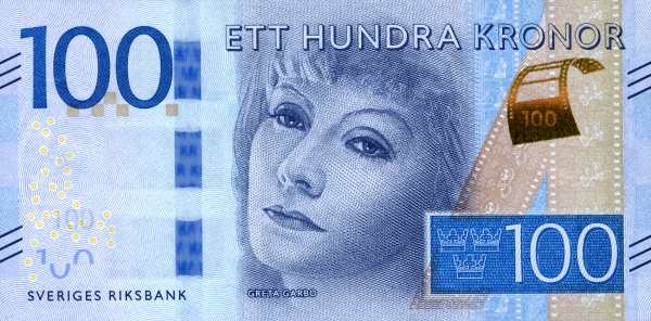 | 100 крон | Синий | Грета Гарбо, всемирно известная голливудская актриса. | Панорама Стокгольма: Королевский дворец, Ратуша и мост Вестерброн. | Район Сёдермальм, где выросла Гарбо, сегодня — один из самых модных в Стокгольме. |