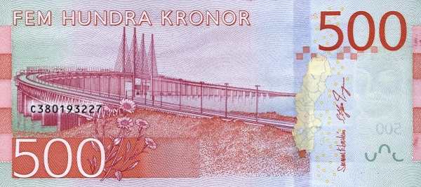 | 500 крон | Красный | Биргита Нильссон, оперная дива, прославившаяся исполнением вагнеровских партий. | Эресуннский мост, соединяющий Швецию и Данию, и цветок нивяник. | По этому мосту можно попасть из Мальмё в Копенгаген — отличный вариант для двухсторонней поездки. |