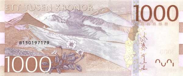 | 1000 крон | Серо-коричневый | Даг Хаммаршёльд, генеральный секретарь ООН, лауреат Нобелевской премии мира. | Горы Лапландии и ее северный цветок — дриада восьмилепестная. | Хаммаршёльд был уроженцем Швеции и любил природу Лапландии, куда сегодня едут за северным сиянием и походами. |