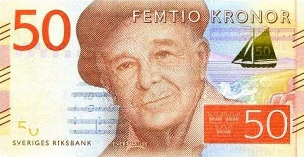 | 50 крон | Желто-оранжевый | Эверт Таубе, поэт, композитор и певец. | Наскальные рисунки в провинции Бохуслен и цветок жимолость вьющаяся. | Бохуслен известен своими скалистыми побережьями и архипелагами — идеальное место для летнего отдыха. |