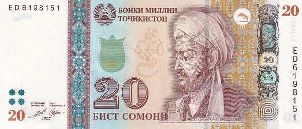 - 20 сомони (Желто-коричневый) — Абу Али ибн Сина (Авиценна) — Ворота Гиссарской крепости
