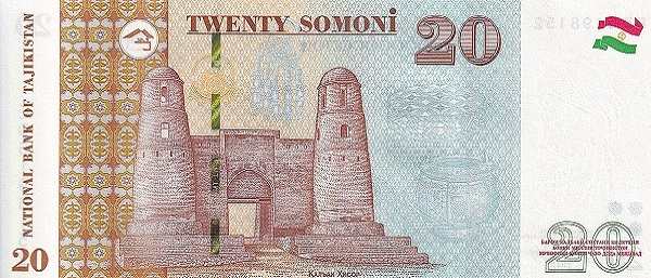 Изображенная на банкноте в 20 сомони, Гиссарская крепость расположена в 30 км от Душанбе. Это историко-культурный заповедник, на территории которого сохранились ворота крепости (арка), медресе, мавзолей и мечеть. Крепость датируется XVIII-XIX веками и была резиденцией бека — наместника бухарского эмира.