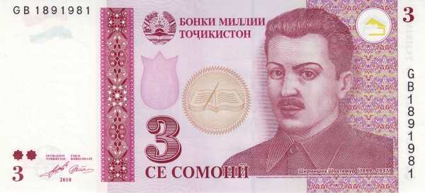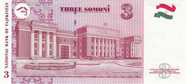 - 3 сомони (Фиолетовый) — Шириншо Шотемор — Здание парламента Таджикистана (Маджлиси Оли)