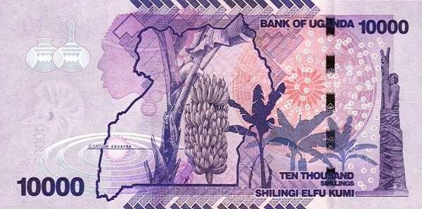 - 10,000 шиллингов: Фиолетовый — Монумент Независимости, водопад; бананы