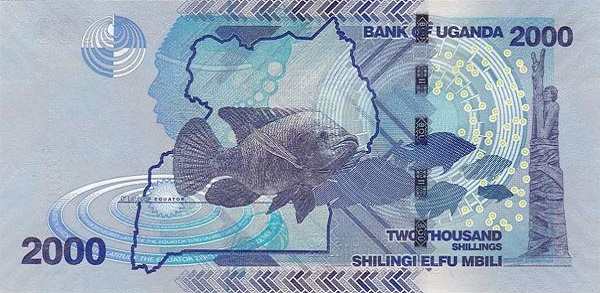 - 2,000 шиллингов: Голубой — Памятник Джону Спику, исток Нила; рыбы