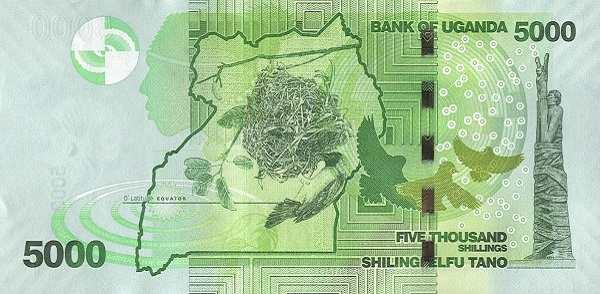 - 5,000 шиллингов: Зелёный — Мемориал жертвам Второй мировой войны; птицы и гнездо