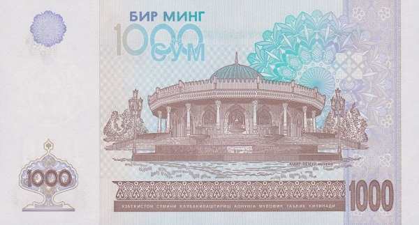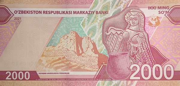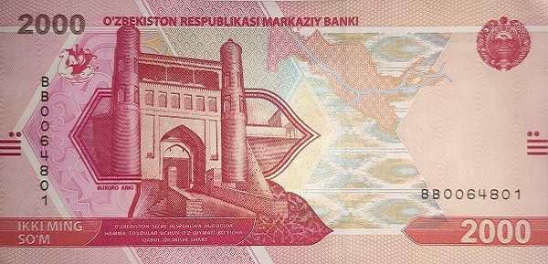 - 2000 сумов: Основные цвета — розовый, бирюзовый. Лицевая сторона — крепость Арк в Бухаре, двугорбый верблюд. Обратная сторона — руины древнего поселения Пайкенд.