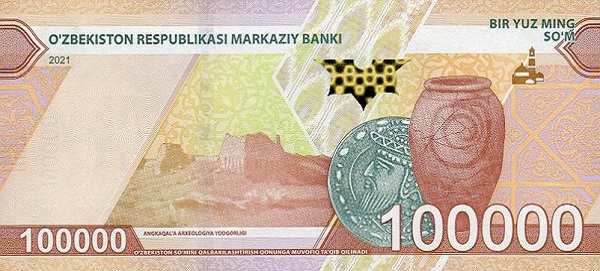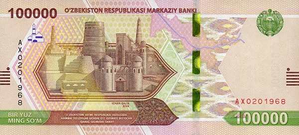 - 100000 сумов: Основные цвета — зелёный, тёмно-коричневый. Лицевая сторона — архитектурный ансамбль Ичан-Калы в Хиве, минарет. Обратная сторона — изображения древней серебряной монеты и керамики.