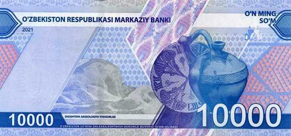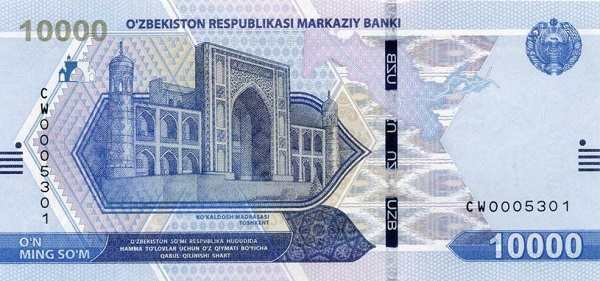 - 10000 сумов: Основные цвета — синий, фиолетовый. Лицевая сторона — медресе Кукельдаш в Ташкенте, символ ворот столицы. Обратная сторона — городище Шош-тепа и изображения древней керамики.