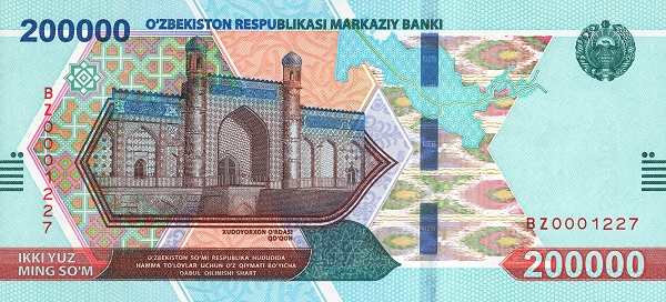 - 200000 сумов: Основные цвета — бирюзовый, коричневый, синий, светло-оранжевый. Лицевая сторона — дворец Худояр-хана в Коканде. Обратная сторона — руины древнего Ахсикента и артефакты (керамика, талисман).