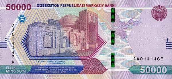 - 50 000 сумов (2017 г.): Лиловые и фиолетовые цвета, на лицевой стороне – арка «Эзгулик» на площади Мустакиллик в Ташкенте.