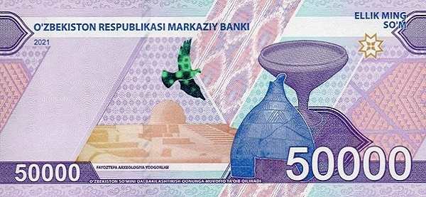 - 50000 сумов: Основные цвета — синий, фиолетовый. Лицевая сторона — мавзолей Аль-Хакима ат-Термизи в Термезе, печать. Обратная сторона — крепость Фаяз-Тепа и изображения древней керамики.
