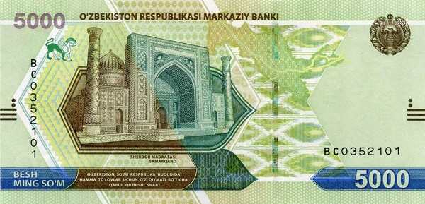 - 5000 сумов: Основные цвета — зелёный, желто-зелёный, коричневый. Лицевая сторона — медресе Шер-Дор в Самарканде, крылатый барс. Обратная сторона — городище Афрасиаб с археологическими находками.
