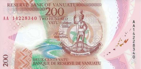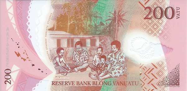| 200 Vt | Полимерная банкнота (с 2014 г.) | Семья, флаг Вануату, раковина. | Семья как основа общества. Раковина — традиционный символ статуса и богатства. |