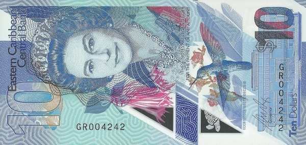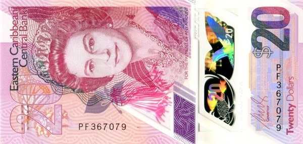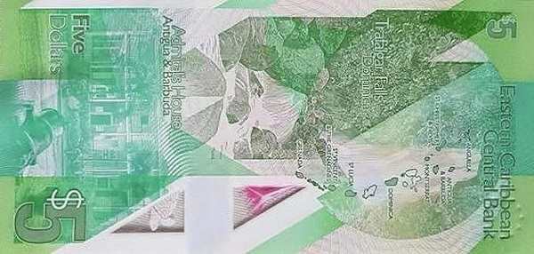 | 5 долларов | Зеленый | На аверсе — королева Елизавета II. На реверсе — водопады Трафальгар (Trafalgar Falls) на острове Доминика и Admiral’s House на Антигуа, архитектурный памятник колониального периода. Защита: водяной знак с портретом, защитная нить, микротекст. |