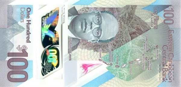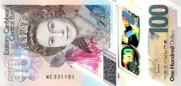 | 100 долларов | Синий/Оранжевый | Наиболее защищенная банкнота с портретом Елизаветы II на аверсе и Сэра Артура Льюиса, «Лес Питонс Вулканс» (Сент-Люсия) на реверсе. Содержит самые современные защитные элементы, включая 3D-голограммы. |