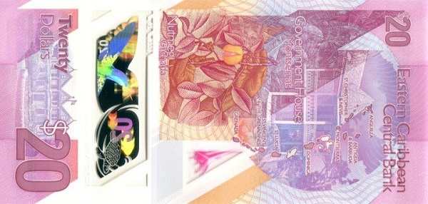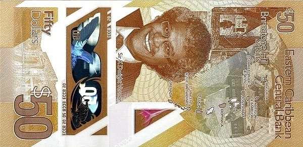 | 50 долларов | Коричневый/Золотистый | Изображение сэра К. Дуайта Веннера, бывшего управляющего банком ECC. Усовершенствованная голограмма и рельефная печать для тактильного определения. |
