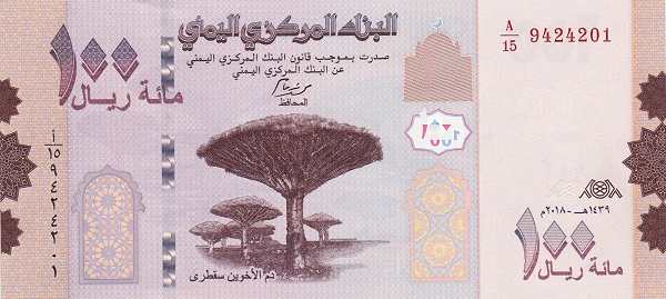 - 100 риалов: банкноты разных выпусков несут различные изображения. На серии 1993 года можно увидеть древние водопропускные трубы в Адене (лицевая сторона) и панораму столицы Саны (оборотная сторона). Банкнота 2018 года посвящена уникальной природе острова Сокотра — на ней изображено драконово дерево (драцена) и традиционные сельскохозяйственные террасы.