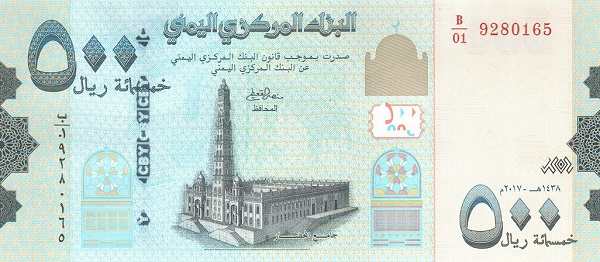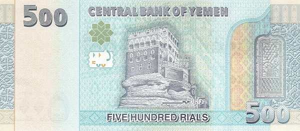 - 500 риалов: в разное время на банкноте этого номинала изображались здание Центрального банка Йемена в Сане, трон царицы Билкис (царицы Савской) в Марибе, а также дворец Дар аль-Хаджар («Дворец на скале») и мечеть Аль-Мухдар в Тариме.
