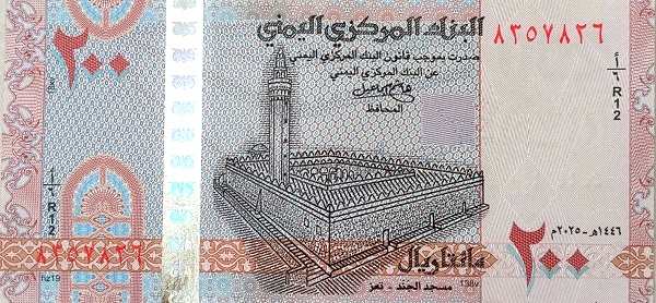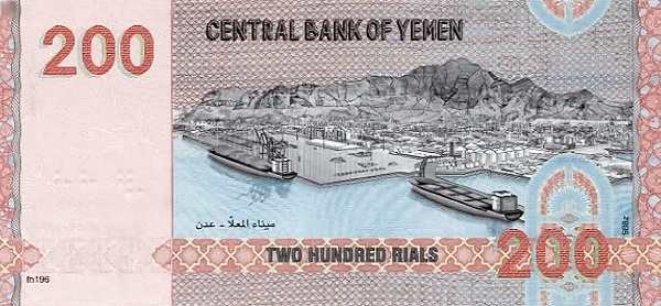 - 200 риалов: на зеленой банкноте 1996 года размещена алебастровая скульптура и вид порта Эль-Мукалла. Желтая банкнота 2018 года показывает крепость Забид и пейзаж провинции Аль-Махра. В 2025 году в обращение была введена новая банкнота номиналом 200 риалов с изображением мечети Аль-Джанад в Таизе и порта Аден.
