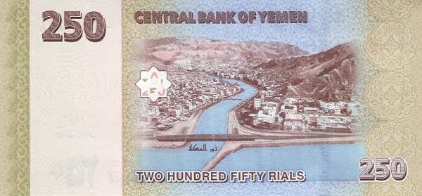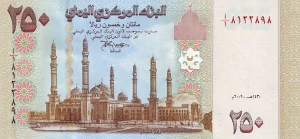 - 250 риалов (коричнево-голубая, выпущена в 2009 году): украшена изображением современной мечети Аль-Салех в Сане и вида Эль-Мукаллы.