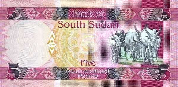- Сельское хозяйство: На 5 фунтах изображено стадо крупного рогатого скота, что отражает значение скотоводства для многих народов Южного Судана. На 10 фунтах рядом с буйволом нарисован ананас, представляющий сельскохозяйственный потенциал.