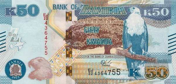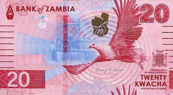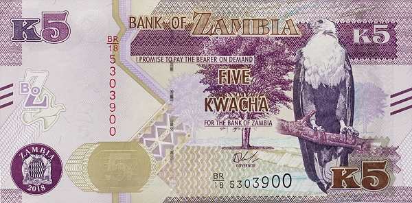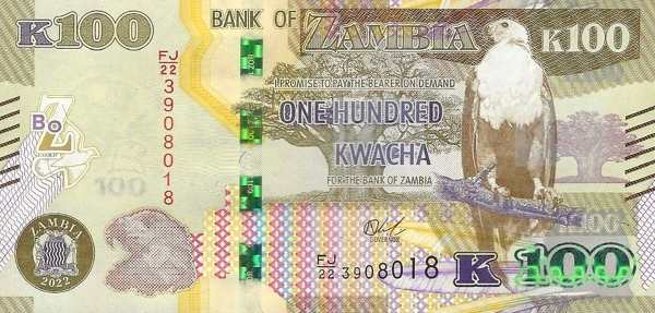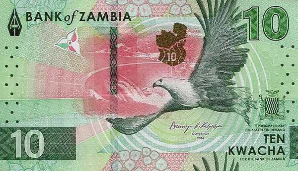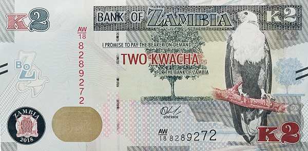 - Аверс (лицевая сторона): На всех купюрах красуется орлан-крикун (Fish eagle) — национальная птица Замбии, а также герб страны.